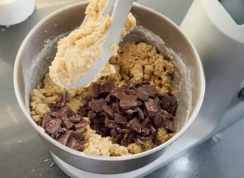 - Use a spatula to gently fold in the chocolate chunks and walnuts. Make sure they are spread evenly through the dough.