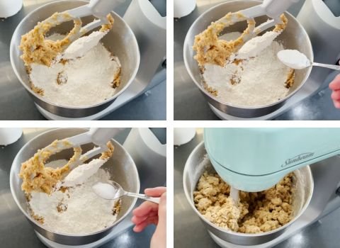 - Add flour, cornstarch, baking soda, baking powder, and a pinch of salt. Mix on low speed until a thick dough forms. The dough should feel soft but not sticky.