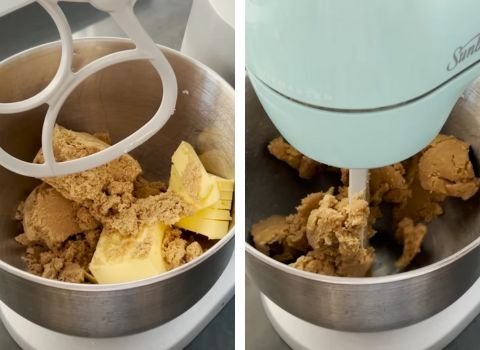 Place the cold butter and brown sugar in a large bowl. Use a mixer to blend them until the mix looks creamy and even. It may take a little longer because the butter is cold, but keep going until the mix is soft and smooth.