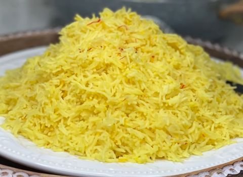 The saffron gives the rice a golden color and a warm smell. Basmati rice is known for its light texture and natural aroma.