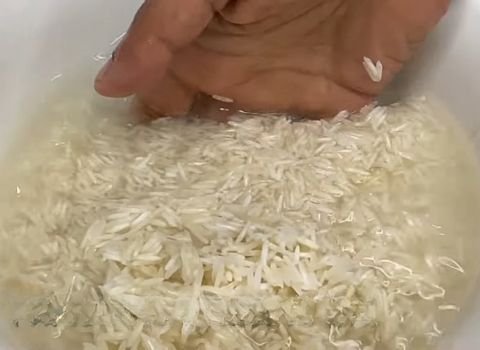 - Place two cups of basmati rice in a bowl. Rinse with cool water twice. This step removes extra starch. Add fresh water to cover the rice. Let it soak while preparing other items. This helps the rice cook evenly.
