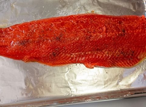 Take your sockeye salmon out of the package. Rinse it under cool tap water to wash off any ice or residue. Pat it very dry with clean paper towels. This step is important because dry salmon cooks better. Line a baking sheet with foil, then place the salmon on top with the skin side down.