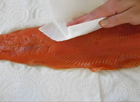 I do rinse it under cool water to be safe. But the most important step is drying it very well with paper towels after you rinse it. If the salmon is wet on top, the seasoning will not stick as well, and the oil will just slide off. A dry surface helps it cook better.