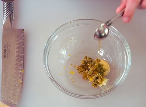 1. First zest a fresh lemon. Use a microplane or fine grater and scrape the yellow skin gently until you have about 1 teaspoon of zest. Add the zest to a medium mixing bowl. Then cut the lemon in half and squeeze out 2 tablespoons of fresh juice. Add the juice to the bowl.