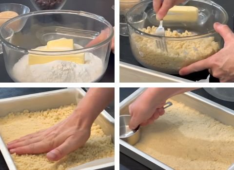 In a large bowl, combine 2 cups of flour, ½ cup of sugar, and 12 tablespoons of softened butter. Use clean hands or a fork to mix until the texture looks like sand. This crumbly mix forms the base layer.