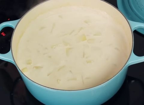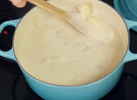 - Add the diced potatoes to the pot. Pour in the chicken broth, whole milk, and heavy cream. Stir everything together well so all the ingredients are combined.