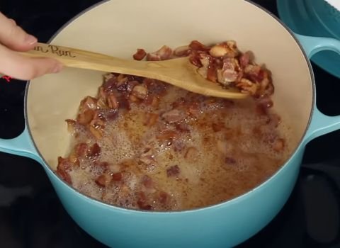- Put your large pot or Dutch oven on the stove and turn the heat to medium. Add the bacon pieces that you already cut up. Cook them until they are crisp. This takes about 6 to 8 minutes. Stir them a few times so they cook evenly. Use a slotted spoon to take the bacon out and put it on a plate lined with paper towels. Leave the bacon grease in the pot. Do not pour it out.