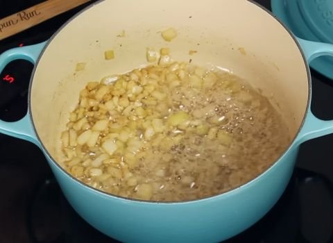 - Add the butter to the bacon grease in the pot. Let it melt completely. Add the chopped onion and cook for 3 to 5 minutes until it becomes soft and clear. Stir it often so it does not burn. Add the minced garlic and cook for about 30 seconds. Stir constantly until you can smell the garlic.