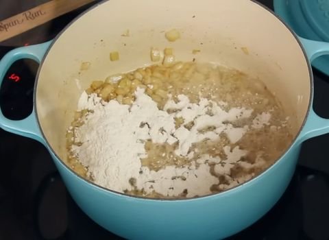 - Sprinkle the flour over the onion and garlic mixture. Stir everything together with a wooden spoon. Keep stirring for 1 to 2 minutes until the flour is fully mixed in and smooth. This will help thicken your soup.