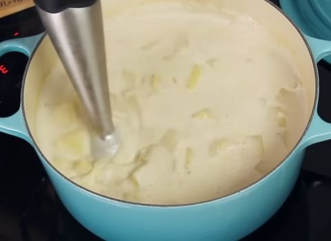 - Use an immersion blender to blend about half of the soup right in the pot. This will make the soup thick while still leaving some potato pieces. If you do not have an immersion blender, carefully pour half of the soup into a regular blender. Blend it until smooth, then pour it back into the pot.