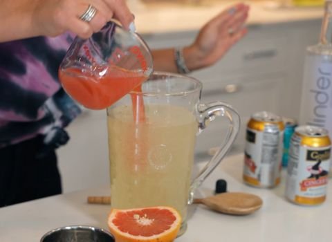 - Add 1 cup pink grapefruit juice. The mix should turn a soft pink color.